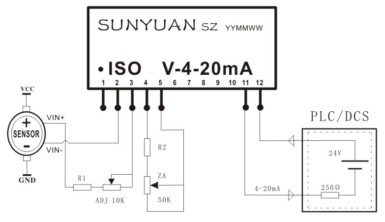 概述: SunYuan SIP12 Pin封裝的二線制電壓信號(hào)隔離配電器:ISO V-4-20mA,是二線制電壓信號(hào)隔離配電模塊,可實(shí)現(xiàn)兩線制電壓輸入配電型傳感器和電橋(稱重)檢測(cè)電路的電壓信號(hào)配送。 產(chǎn)品設(shè)計(jì)為低成本、小體積的標(biāo)準(zhǔn)SIP12 Pin阻燃IC封裝,內(nèi)部包含電流信號(hào)調(diào)制電路,電磁隔離變換電路及信號(hào)還原解調(diào)電路。供電電壓范圍12-32VDC,輸入等效電阻小、線性度高,信號(hào)輸入與輸出之間可達(dá)到2500VAC隔離耐壓。產(chǎn)品使用十分方便,客戶只需在產(chǎn)品前端加上少量外圍器件,即可實(shí)現(xiàn)兩線制電壓輸入配電型傳感器和電橋(稱重)檢測(cè)電路的電壓信號(hào)隔離輸出功能,用戶設(shè)計(jì)時(shí)可參考典型應(yīng)用電路圖。 SMD工藝結(jié)構(gòu)及新技術(shù)隔離措施使該器件能達(dá)到:信號(hào)輸入與輸出3KVDC隔離(全隔離型),并且能滿足工業(yè)級(jí)寬溫度、潮濕、震動(dòng)的現(xiàn)場(chǎng)惡劣工作環(huán)境要求! ISO V-4-20mA二線制電壓信號(hào)隔離配電器使用非常方便,只需很少外部元件,可實(shí)現(xiàn)兩線制電壓輸入配電型傳感器和電橋(稱重)檢測(cè)電路的電壓信號(hào)配送。 SY系列的輸入、輸出非隔離型產(chǎn)品,具有很高的精度和線性度(優(yōu)于0.05F.S),常用在內(nèi)置式電子尺、角位移信號(hào)變送器等精密測(cè)量?jī)x器儀表中。產(chǎn)品體積小、安裝方便,可安置在傳感器內(nèi)部直接將位移、角度信號(hào)轉(zhuǎn)換成標(biāo)準(zhǔn)的4-20mA信號(hào),滿度和零點(diǎn)都可由用戶通過外接電位器調(diào)節(jié)、校準(zhǔn)。