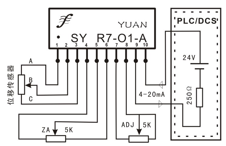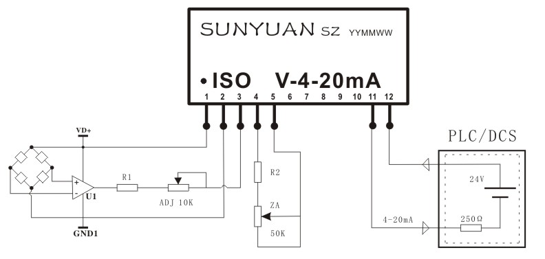 二、非隔離型高精度電壓信號(hào)無源配電器 IC:SY R-P-O (Sip10Pin) 應(yīng)力、電阻信號(hào)無源配電放大器SY R-P-O系列產(chǎn)品,可將壓力、稱重、直線或角位移傳感器輸出信號(hào)進(jìn)行高精度放大并轉(zhuǎn)換成標(biāo)準(zhǔn)的兩線制4-20mA模擬信號(hào),滿度和零點(diǎn)都可由用戶通過外接電位器調(diào)節(jié)、校準(zhǔn)。 1、電阻信號(hào)無源配電放大器典型應(yīng)用圖