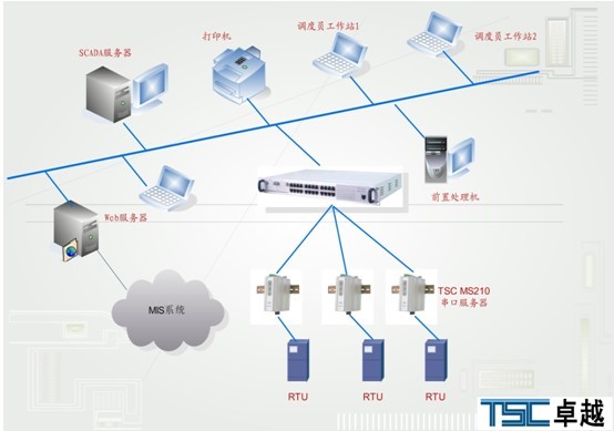 本案例中,縣級電力調度監(jiān)控系統(tǒng)和變電站集中控制中心(集控站)中大量采用了TSC公司的串口設備聯(lián)網服務器MS210系列產品,作為RTU(遠方數據采集單元)或其它數據采集設備通過串口通信接入SCADA局域網的解決方案。具有良好的性能價格比。