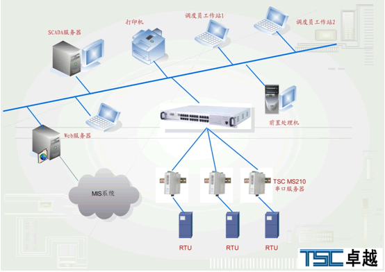 本案例中,縣級(jí)電力調(diào)度監(jiān)控系統(tǒng)和變電站集中控制中心(集控站)中大量采用了TSC公司的串口設(shè)備聯(lián)網(wǎng)服務(wù)器MS210系列產(chǎn)品,作為RTU(遠(yuǎn)方數(shù)據(jù)采集單元)或其它數(shù)據(jù)采集設(shè)備通過串口通信接入SCADA局域網(wǎng)的解決方案。具有良好的性能價(jià)格比。 三、方案優(yōu)勢(shì)及效益 性能可靠,具有良好的性價(jià)比具有良好的擴(kuò)展性,方便網(wǎng)絡(luò)擴(kuò)容 |