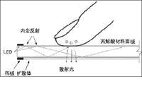 多點(diǎn)觸控技術(shù)的核心是FTIR(Frustrated Total Internal Reflection),即受抑內(nèi)全反射技術(shù)。如圖2所示,由LED(發(fā)光二極管)發(fā)出的光束從觸摸屏截面照向屏幕的表面后,將產(chǎn)生反射。如果屏幕表層是空氣,當(dāng)入射光的角度滿足一定條件時(shí),光就會(huì)在屏幕表面完全反射。但是如果有個(gè)折射率比較高的物質(zhì)(例如手指)壓住丙烯酸材料面板,屏幕表面全反射的條件就會(huì)被打破,部分光束透過(guò)表面,投射到手指表面。凹凸不平的手指表面導(dǎo)致光束產(chǎn)生散射(漫反射),散射光透過(guò)觸摸屏后到達(dá)光電傳感器,光電傳感器將光信號(hào)轉(zhuǎn)變?yōu)殡娦盘?hào),系統(tǒng)由此獲得相應(yīng)的觸摸信息。