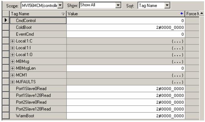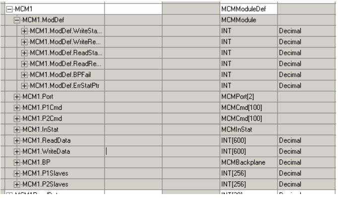 MCM1.ReadData: 讀數據區(qū)。一個從 Master 設備寫到作為 Slave設備的通訊口,或從 Slave設備讀取的數據。這個位置的數據是從 MVI56-MCM模塊返回到ControlLogix處理器的。 MCM1.WriateData: 寫數據區(qū)。位于 MCM1.WriteData中的數據是 ControlLogix處理器的信息及需要寫到模板的內部數據庫的信息。包括寫到 Slave設備的信息(設為 Master時),或寫到模板的信息(當口組態(tài)為 Slave時)。