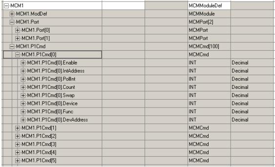 MCM1.P1Cmd,MCM1.P2Cmd 是用來設定模板的 Modbus master 命令。每個口最多可組態(tài) 100個 Modbus master 命令。