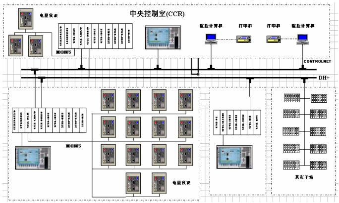 摘要: 整個廠區(qū)的自動化控制由7個PLC站組成。全部采用了羅克韋爾自動化的PLC,通過CONTROLNET與中控室進行通訊。全廠的通訊采用LOGIX5000系列的DHRIO模板將 DH+網的數據采集后由CONTROLNET傳送到中控室計算機。計算機監(jiān)控系統(tǒng)由羅克韋爾自動化公司的RSVIEW組成,負責整個廠區(qū)的設備監(jiān)控及報警。由MVI56- MCM模塊將輸出設備的電流,電壓及功率這些電量數據傳輸到PLC。