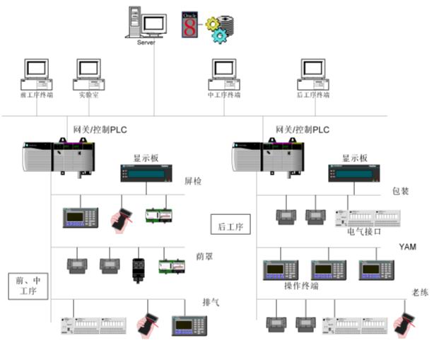 1. 對每一個產(chǎn)品(顯像管)都設(shè)立一個唯一的標(biāo)識號ID,當(dāng)顯像管經(jīng)過關(guān)鍵工序時,工業(yè)條形碼閱讀器會讀取這個唯一的標(biāo)識號,并記錄產(chǎn)品的信息。 2. 下游工序會根據(jù)上游工序的信息決定產(chǎn)品的流向,如果發(fā)生型號不對時要馬上報警和停機,減少廢品量。 3. 在顯像管成品包裝工序,每個顯像管都要通過手持的無線條碼閱讀器讀取條碼,及時匹配批號,批號不符要立即報警,禁止打包,徹底杜絕混包現(xiàn)象。 4. 對工廠測試的顯像管進行跟蹤記錄,提高測試的成功率和效果。 5. 記錄設(shè)備的起停時間,得出設(shè)備和生產(chǎn)線的OEE(整體設(shè)備效率)報表。 6. 采集顯像管的缺陷信息,供質(zhì)量分析時調(diào)用。