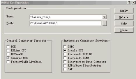 RSSQL通過控制連接器用DDE、OPC、RSLinx、RSView32或FactoryTalk 方式和各種類型控制系統(tǒng)相連。再通過企業(yè)連接器以O(shè)DBC、OCI(Oracle Callable Interface)、OLE-DB、COM+等方式和各種不同類型的數(shù)據(jù)庫系統(tǒng)相連,包括SQL Server, Access, Oracle, Sybase, DB2等,或和SAP系統(tǒng)或基于MTS/COM+的應(yīng)用相連。在Thomson彩管廠跟蹤系統(tǒng)中,采用高效率的Generic OPC協(xié)議和ControlLogix Gateway 連接,采用Oracle專用的OCI接口與Oracle 8i數(shù)據(jù)庫進行數(shù)據(jù)交換。