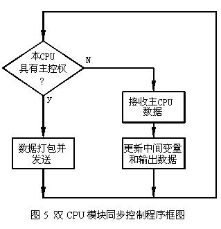 由于熱備CPU隨時(shí)準(zhǔn)備著,一旦主CPU故障,就立即獲取主控制權(quán)而成為主控CPU,因此,主CPU必須將自己的信息隨時(shí)傳遞給熱備CPU,而熱備CPU必須跟蹤主CPU的變化,與主CPU保持同步,這樣,在兩塊CPU模塊進(jìn)行控制權(quán)的轉(zhuǎn)移時(shí),實(shí)現(xiàn)無(wú)擾動(dòng)切換。CPU模塊的同步控制程序框圖如圖5所示。