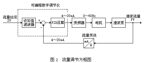 渣漿流量由流量傳感器檢測,轉(zhuǎn)換成4~20mA信號送至可編程數(shù)字調(diào)節(jié)儀輸入,流量設(shè)定由上位機給出送調(diào)節(jié)儀外給定,控制運算利用調(diào)節(jié)儀提供的功能塊組態(tài)實現(xiàn)。調(diào)節(jié)儀面板上可實現(xiàn)手動調(diào)節(jié)流量及手動/自動轉(zhuǎn)換操作。系統(tǒng)組成如圖1所示。