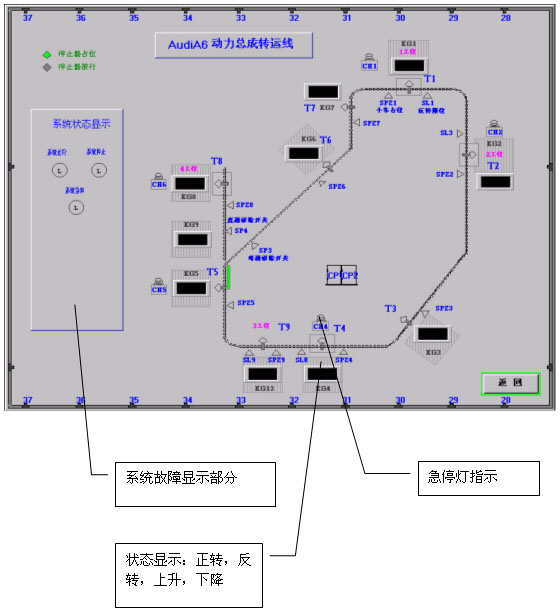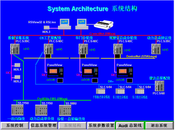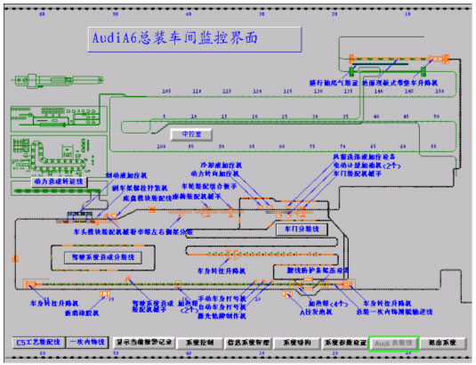 一汽大眾總裝車間實(shí)時(shí)監(jiān)控系統(tǒng)是用于控制整車車身工藝裝配線及各個(gè)分裝線的實(shí)時(shí)監(jiān)控系統(tǒng),它的主要功能是對整車裝配生產(chǎn)進(jìn)行監(jiān)控.該系統(tǒng)采用美國羅克韋爾自動(dòng)化公司的RSVIEW32工業(yè)監(jiān)控圖形組態(tài)軟件制作而成。該組態(tài)軟件運(yùn)行于WINDOWS95以上操作系統(tǒng)平臺,共分為以下幾部分:實(shí)時(shí)顯示部分;故障報(bào)警部分;信息查詢管理部分;梯形圖,CAD圖輔助診斷部分;系統(tǒng)運(yùn)行參數(shù)設(shè)定部分等等。該系統(tǒng)的控制部分還采用了網(wǎng)絡(luò)控制技術(shù)及現(xiàn)場工業(yè)總線技術(shù),其中包括:ControlNet, DeviceNet , Fieldbus, EtherNet等. 該系統(tǒng)的優(yōu)點(diǎn)是能夠直觀迅速地反映生產(chǎn)現(xiàn)場的實(shí)際情況,可以在中央控制室對生產(chǎn)線遠(yuǎn)程進(jìn)行起動(dòng)/停止控制,同時(shí)可以調(diào)出各個(gè)子模塊的梯形圖對其進(jìn)行編輯/調(diào)試,它還具有故障顯示/查找功能.根據(jù)中德雙方股東(第一汽車集團(tuán)公司和德國大眾股份公司)的戰(zhàn)略規(guī)劃要求,轎車一廠的生產(chǎn)能力于今年10月要達(dá)到年產(chǎn)三十三萬輛,即兩條總裝生產(chǎn)線要同時(shí)進(jìn)行混流生產(chǎn),AUDI B6和AUDI C6混流生產(chǎn)線實(shí)現(xiàn)生產(chǎn)節(jié)拍4分鐘/輛,而JETTA/BORA/GOLF生產(chǎn)線實(shí)現(xiàn)節(jié)拍85秒/輛,并且兩條裝配線均是按照三班生產(chǎn),300工作日/年計(jì)算.