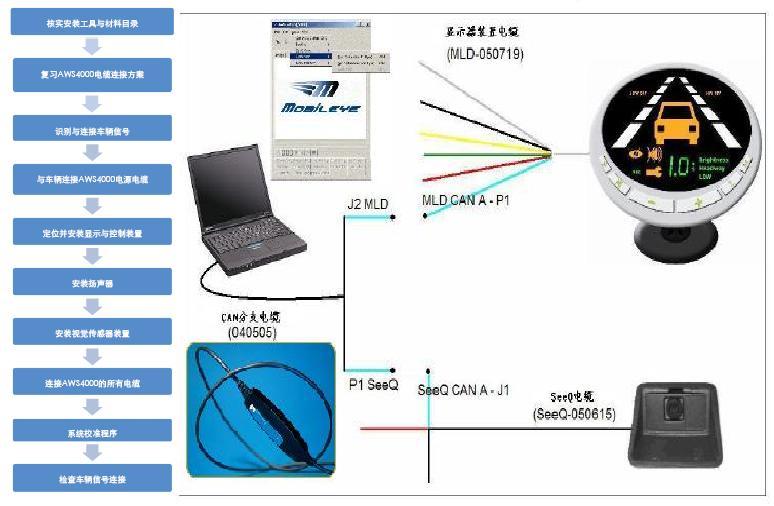 AWS系統(tǒng)的安裝類似安裝倒車?yán)走_(dá),但并不需要破壞原車的任何線路或是部件。首先找到車輛的一些信號(轉(zhuǎn)向燈信號,剎車信號,車速信號等),通過電纜將其接入AWS系統(tǒng)中央控制盒。然后將攝像頭固定在駕駛室內(nèi)前風(fēng)擋玻璃中央,接好攝像頭的電纜線,將視頻信號接入筆記本,用相應(yīng)軟件進(jìn)行初始設(shè)置。而后在車內(nèi)左右側(cè)分別安裝用于聲音提醒的揚(yáng)聲器,并固定圖像顯示器,接好相關(guān)線束后進(jìn)行最后的路試,檢查AWS各功能是否正常。整個(gè)安裝過程,基本半天的時(shí)間就能完成,而且如需拆卸,也非常方便。