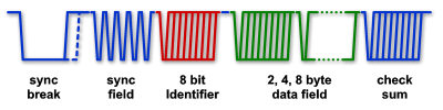 通過LIN總線傳輸?shù)膶嶓w為幀。一個報文幀由幀頭以及回應(數(shù)據(jù))部分組成。在一個激活的LIN 網(wǎng)絡中,通訊通常由主節(jié)點啟動,主節(jié)點任務發(fā)送包含有同步間隙的報文頭,同步字節(jié)以及報文標志符(ID)。一個從節(jié)點的任務通過接收并過濾標志符被激活,并啟動回應報文的傳送;貞邪1到8個字節(jié)的數(shù)據(jù)以及一個字節(jié)的校驗碼。