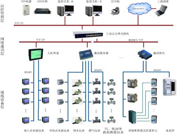 站控管理層針對能耗監(jiān)測系統(tǒng)的管理人員,是人機(jī)交互的直接窗口,也是系統(tǒng)的最上層部分。主要由系統(tǒng)軟件和必要的硬件設(shè)備,如工業(yè)級計算機(jī)、打印機(jī)、UPS電源等組成。監(jiān)測系統(tǒng)軟件具有良好的人機(jī)交互界面,對采集的現(xiàn)場各類數(shù)據(jù)信息計算、分析與處理,并以圖形、數(shù)顯、聲音等方式反映現(xiàn)場的運(yùn)行狀況。