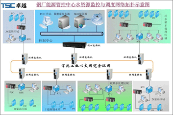 一、概述 鋼鐵企業(yè)的水系統(tǒng)主要通過能源動力廠下屬4個供水和處理車間(供水車間、環(huán)水車間、板坯水處理車間和綜合水處理車間)實現(xiàn)全場水資源的分配和處理。 水資源和監(jiān)控與調(diào)度系統(tǒng)主要功能是將能源動力廠管轄的水源地、用戶、水庫、和管網(wǎng)監(jiān)測點之間通過工業(yè)以太網(wǎng)交換機進行連接,實時地把水源、用戶、水庫和工藝設(shè)備的運行狀態(tài)參數(shù)和水壓、流量、水位和溫度等參數(shù)采集到調(diào)度中心,進行集中處理。 水系統(tǒng)網(wǎng)絡(luò)按照三層結(jié)構(gòu)設(shè)計:控制中心、各監(jiān)控站點,現(xiàn)場設(shè)備?刂浦行膬(nèi)部采用通用的Ethernet作為系統(tǒng)的骨架,構(gòu)建10/100M的網(wǎng)絡(luò)。采用卓越TSC工業(yè)以太網(wǎng)三層交換機組建整個網(wǎng)絡(luò)的數(shù)據(jù)交換中心,與外部節(jié)點的連接采用工業(yè)冗余光纖網(wǎng)絡(luò)。 二、網(wǎng)絡(luò)拓撲示意圖
