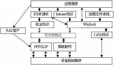 Windows CE的網(wǎng)絡(luò)通信基于一個(gè)按層組織的網(wǎng)絡(luò)堆棧[1 ] (network stack) ,如圖2所示。網(wǎng)絡(luò)堆棧實(shí)際上是Windows CE 的一個(gè)組件,它絡(luò)堆棧實(shí)際上是Windows CE 的一個(gè)組件,它負(fù)責(zé)對(duì)網(wǎng)絡(luò)中的數(shù)據(jù)傳輸進(jìn)行處理,將來(lái)自于應(yīng)用程序的數(shù)據(jù)分解成若干小段,并為每小段加上相關(guān)地址和段的分割信息,組成可以存貯轉(zhuǎn)發(fā)的信息包(packets) ,信息包中的地址確保數(shù)據(jù)達(dá)到最終的目的端點(diǎn)。訪問(wèn)網(wǎng)絡(luò)堆棧有如下三種方式:第一種是WinSock端口套接字方式。這是一個(gè)中間層的傳輸接口協(xié)議,WinSock 負(fù)責(zé)對(duì)建立的信息包的所有頭信息細(xì)節(jié)進(jìn)行處理, 但可以不管其數(shù)據(jù)格式。Windows CE 的網(wǎng)絡(luò)通信都直接或間接地使用WinSock。采用IrDA 協(xié)議實(shí)現(xiàn)基于紅外線套接字的客戶/ 服務(wù)器網(wǎng)絡(luò)通信是Windows CE平臺(tái)的一個(gè)特色。第二種為WinInet API 方式。WinInet API是微軟公司基于Win32 平臺(tái)的互聯(lián)網(wǎng)函數(shù)接口。Windows CE 的WinInet API 對(duì)其進(jìn)行了某些限制或擴(kuò)展,它提供的高級(jí)數(shù)據(jù)協(xié)議除了常見(jiàn)的超文本傳輸協(xié)議HTTP 和文件傳輸協(xié)議FTP 外,還提供了對(duì)SSL的支持。API 方式避免了直接使用WinSock 訪問(wèn)網(wǎng)絡(luò)的操作,簡(jiǎn)化了網(wǎng)絡(luò)編程。第三種為CIFS 重定位器方式。Windows CE 通過(guò)對(duì)遠(yuǎn)程訪問(wèn)服務(wù)RAS 客戶的支持,允許基于Windows CE的設(shè)備與遠(yuǎn)程主機(jī)建立連接。