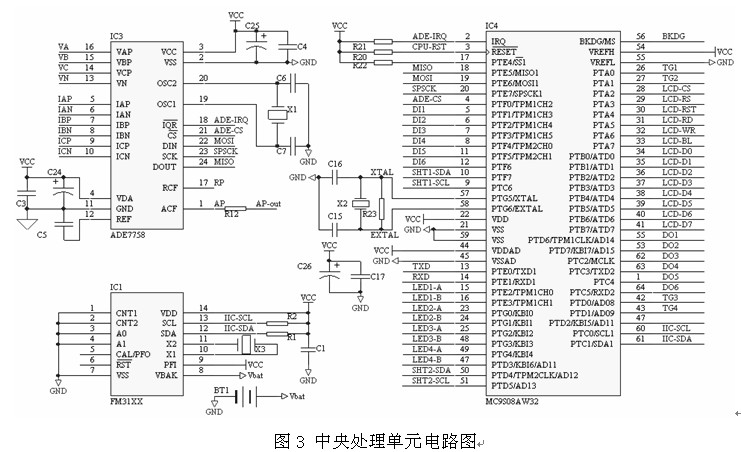 中央處理單元電路圖如圖3 所示,CPU 對采樣信號進行處理計算,根據(jù)測量得到的電流、電壓、溫濕度值與預(yù)先設(shè)定的各種保護數(shù)值進行對比,由此來判斷開關(guān)柜的電壓電流是否正常、溫濕度狀況是否正常,若不正常則輸出相應(yīng)的告警信息。外部擴展了鐵電存儲器,用于存儲一些重要的參數(shù),即使以后升級程序也不會丟失先前的重要數(shù)據(jù)。