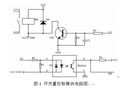 開關(guān)量控制模塊包括開關(guān)量輸入和告警輸出,其電路圖如圖4 所示。開關(guān)量輸入經(jīng)光電耦合接入CPU ;告警由GPIO 口經(jīng)光電耦合器連接到繼電器輸出。開關(guān)量輸入設(shè)有8 路,依次對應(yīng)一次圖中的斷路器合、斷路器分、手車工作位置、手車試驗位置、接地刀位置以及彈簧儲能指示,其余預(yù)留。開關(guān)量輸入對應(yīng)一次圖可編程設(shè)置。開關(guān)量輸出設(shè)有6 路,依次輸出加熱器1 、加熱器2 、風(fēng)扇、告警、照明、閉鎖的狀態(tài)。