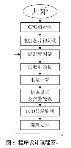 主程序完成上電或復(fù)位初始化,電能芯片初始化,其他外設(shè)初始化,溫濕度測量,讀取電參數(shù),電量計算,狀態(tài)顯示及報警處理,LCD 顯示刷新及按鍵處理等功能,程序設(shè)計流程如圖5 。