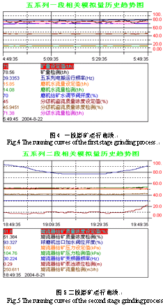 Abstract:The grinding processes in mineral processing plants are characterized by non-linearity, time-variability, with large inertia. Furthermore, their boundary conditions often change during operation, and technical indexes such as grinding particle size are difficult to measure online, and optimizing control is difficult to achieve. These often result in unstable operation, so the product quality and grinding efficiency cannot be guaranteed. This paper develops a hierarchical integrated automation system for this complex process, consisting of an intelligent optimizing process control layer and a process management layer. The structure, functions of the system and the intelligent optimizing control strategy are discussed. The intelligent optimizing process control layer includes an intelligent optimal setting system and a loop control system. Technical indexes are predicted by the soft-sensors, and the basic loop setpoints are optimized by the optimal setting models based on the prediction. This system has been successfully applied in a large mineral processing plant. The grinding processes have been stabilized, and key technical indexes have been evidently improved. Key words:grinding; integrated automation system;optimizing control 0 引言 磨礦過(guò)程是選礦廠的中間工序。礦石經(jīng)過(guò)物理的研磨、分級(jí)作用,顆粒由大變小到一定的程度,才能達(dá)到礦石的單體解離或近于單體解離,有利于選別工序的金屬回收和金屬富集。因此磨礦過(guò)程是影響選礦生產(chǎn)的關(guān)鍵環(huán)節(jié),直接制約著選礦產(chǎn)品質(zhì)量和金屬回收率。此外,磨礦作業(yè)能耗占選礦廠整個(gè)選礦過(guò)程的40%~60%。因此磨礦過(guò)程實(shí)現(xiàn)自動(dòng)控制具有重要意義。國(guó)外對(duì)磨礦過(guò)程的建模與控制的研究已經(jīng)相當(dāng)深入,控制方法包括優(yōu)化控制[1],多變量控制[2] ,預(yù)測(cè)控制[3],但是國(guó)外的磨礦流程和設(shè)備與我國(guó)不盡相同,國(guó)外一般都用棒磨機(jī)為一段開(kāi)路磨礦,或以新給礦配水力旋流器構(gòu)成磨礦閉路,并普遍使用粒度計(jì)等高精密在線檢測(cè)儀表,因此其研究成果難以適用于實(shí)現(xiàn)我國(guó)磨礦過(guò)程的自動(dòng)控制。國(guó)外對(duì)于磨礦粒度的軟測(cè)量的研究,僅限于用來(lái)代替常規(guī)儀表實(shí)現(xiàn)回路控制[4]。我國(guó)的磨礦過(guò)程具有自身特點(diǎn),廣泛使用螺旋分級(jí)機(jī)。磨礦過(guò)程本身的大慣性、參數(shù)時(shí)變、非線性、邊界條件波動(dòng)大等復(fù)雜特性,以及關(guān)鍵工藝指標(biāo)磨礦粒度難以在線測(cè)量,導(dǎo)致在我國(guó)磨礦過(guò)程自動(dòng)化水平低,目前只在部分廠礦實(shí)現(xiàn)了給礦、給水等基礎(chǔ)回路的自動(dòng)控制。歐洲鋼鐵工業(yè)技術(shù)發(fā)展指南指出:“對(duì)于降低生產(chǎn)成本、提高產(chǎn)品質(zhì)量、減少環(huán)境污染和資源消耗只能通過(guò)全流程自動(dòng)控制系統(tǒng)的優(yōu)化設(shè)計(jì)來(lái)實(shí)現(xiàn)[5]”。文獻(xiàn)[6]針對(duì)選礦過(guò)程提出了過(guò)程穩(wěn)定化、過(guò)程優(yōu)化、過(guò)程管理三層結(jié)構(gòu)的自動(dòng)化系統(tǒng)。文獻(xiàn)[7]提出了企業(yè)資源計(jì)劃(ERP)/制造執(zhí)行系統(tǒng)(MES)/過(guò)程控制系統(tǒng)(PCS)三層結(jié)構(gòu)的金礦企業(yè)綜合自動(dòng)化系統(tǒng),成功應(yīng)用于遼寧省排山樓金礦,且成效顯著。結(jié)合磨礦的生產(chǎn)技術(shù)要求及工藝特點(diǎn),從穩(wěn)定產(chǎn)品質(zhì)量、提高磨礦效率、降低能耗的總體控制目標(biāo)出發(fā),基于優(yōu)化關(guān)鍵生產(chǎn)工藝指標(biāo)的實(shí)際出發(fā),結(jié)合專家系統(tǒng)、案例推理等人工智能技術(shù),提出了過(guò)程管理系統(tǒng)和過(guò)程控制系統(tǒng)組成的二層結(jié)構(gòu)的磨礦過(guò)程綜合自動(dòng)化系統(tǒng)。 1 磨礦過(guò)程描述 磨礦過(guò)程主要是將礦石經(jīng)過(guò)磨礦過(guò)程,處理成細(xì)粒度級(jí)的顆粒,提供給選別作業(yè)。其工藝流程圖如圖1所示。圓筒礦倉(cāng)內(nèi)的粉礦經(jīng)由電振排料機(jī)、給礦皮帶,送入一段球磨機(jī)內(nèi),經(jīng)過(guò)球磨機(jī)、雙螺旋分級(jí)機(jī)組成的一段閉路磨礦系統(tǒng)細(xì)磨后,再經(jīng)過(guò)細(xì)篩的篩分作用,大顆粒的礦石被送入由二段球磨機(jī)、水力旋流器組成的二段閉路磨礦系統(tǒng)繼續(xù)再磨,水力旋流器的溢流和經(jīng)篩分作用后的小顆粒被送入選別工序。為了保證磨礦分級(jí)效果,必須在一段磨機(jī)入口、一段磨機(jī)出口和二段泵池處分別加入一定流量的清水。 磨礦過(guò)程最關(guān)鍵的工藝指標(biāo)是二段磨礦的旋流器溢流粒度指標(biāo)。從控制的角度看,影響磨礦作業(yè)的主要因素有一段球磨機(jī)給礦量、一段球磨機(jī)磨礦質(zhì)量濃度、螺旋分級(jí)機(jī)溢流質(zhì)量濃度、水力旋流器給礦壓力、水力旋流器給礦質(zhì)量濃度等。保持球磨機(jī)給礦量穩(wěn)定,使其不波動(dòng)或波動(dòng)范圍很小,對(duì)穩(wěn)定產(chǎn)品質(zhì)量、穩(wěn)定球磨機(jī)磨礦過(guò)程都是很重要的因素,同時(shí)從經(jīng)濟(jì)效益的角度考慮應(yīng)保證球磨機(jī)的最大處理能力。對(duì)于格子型球磨機(jī)來(lái)說(shuō),一個(gè)比較合適的磨礦質(zhì)量濃度是實(shí)