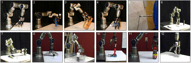 圖 13: 抓取和操作其它物體的演示, 包括1)鉗子,2)手電筒,3)木頭塊,4)瓶子,5)筆,6)螺絲刀,7)電話,8)訂書機(jī),9)倒水, 10)將電池裝到手電筒里,11)打開(kāi)瓶蓋, 12) 手機(jī)。