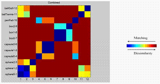 圖 10: 形狀匹配算法的評(píng)價(jià),在兩個(gè)軸線上的物體以相同的順序排列,每個(gè)物體和本身比較,也和所有其他的物體比較。藍(lán)顏色表示相異值較低或接近的匹配。一個(gè)完美的匹配結(jié)果圖表是對(duì)角線是藍(lán)色其它方格里顏色離藍(lán)色較遠(yuǎn)。