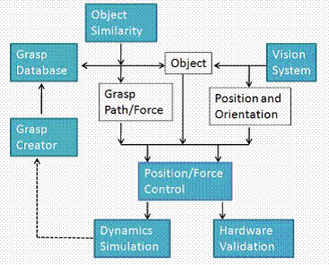 機(jī)器人抓取的數(shù)據(jù)庫(kù)的方法,適用于所有的類型的物體。通過(guò)圖形界面,用戶可以修改抓取的動(dòng)作和進(jìn)行準(zhǔn)確的動(dòng)態(tài)模擬。數(shù)據(jù)庫(kù)建成樹(shù)狀結(jié)構(gòu)。根據(jù)物體的形狀,關(guān)節(jié),軟硬程度,和表面特性等物體的特征用來(lái)搜索相似的物體及其抓取動(dòng)作。每一個(gè)節(jié)點(diǎn)包含一種特定的物體相似性的算法。 每一個(gè)節(jié)點(diǎn)都可以執(zhí)行快速的計(jì)算,一旦理想的相似的物體被搜索到?梢月匀ハ旅娴乃阉饔(jì)算。系統(tǒng)的輸入是一個(gè)物體的描述。輸出是抓取的路徑和力。該工具包支持力控制的整合, 并且抓取的路徑和力可以通過(guò)Energid專利的運(yùn)動(dòng)控制和高逼真度的動(dòng)態(tài)仿真測(cè)試和改進(jìn)。