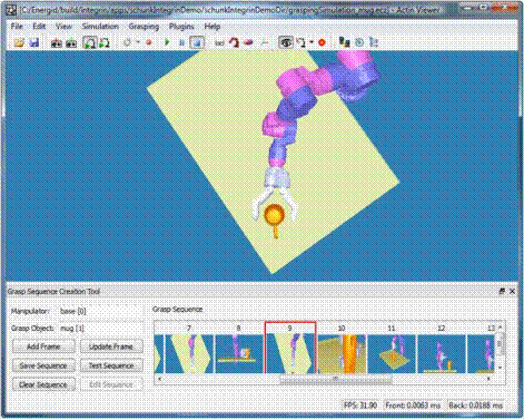 抓取和操作工具的一個(gè)強(qiáng)大的功能是能夠儲(chǔ)存抓取動(dòng)作序列。手臂和手的逆運(yùn)動(dòng)學(xué)可以用Energid開(kāi)發(fā)的Actin工具包來(lái)控制。和機(jī)器視覺(jué)軟件整合,機(jī)器視覺(jué)系統(tǒng)提供物體的方位給機(jī)器人,因此一套抓取動(dòng)作序列可以用于在一個(gè)較大范圍內(nèi)抓取物體。