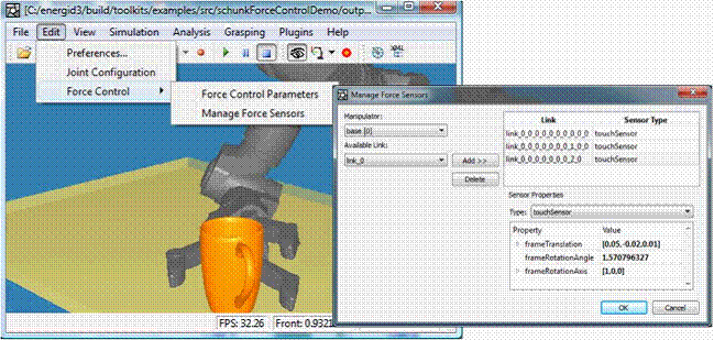 力控制插件是個(gè)工具,它與抓取創(chuàng)作圖形界面結(jié)合,允許用戶用使用所提供的力控制框架而無(wú)需寫C++程序。此插件允許用戶定義和管理力傳感器類型,力量控制的具體參數(shù),在主動(dòng)力控制框架中的每個(gè)傳感器的力。通過(guò)改變控制參數(shù)和傳感器的位置和類型,該控 制系統(tǒng)可以容易地配置和編輯。