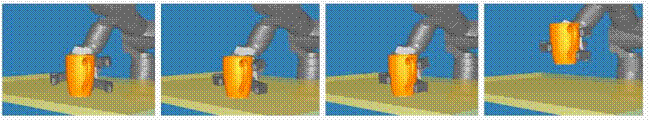 抓取和操作的創(chuàng)作可以通過(guò)圖形界面移動(dòng)附加在機(jī)器手上的點(diǎn)和框架, 或改變關(guān)節(jié)的角度。 然后可以通過(guò)移動(dòng)手指尖接觸物體進(jìn)一步改進(jìn)抓取動(dòng)作。在創(chuàng)作過(guò)程中,會(huì)用到具體的手臂和手,或只有手。 抓取的動(dòng)作序列的創(chuàng)作過(guò)程是視覺(jué)化的創(chuàng)作,編輯和記錄。 圖2所示的是使用抓取創(chuàng)作工具創(chuàng)作用Schunk公司的手臂和手抓取和操作一個(gè)杯子的序列。