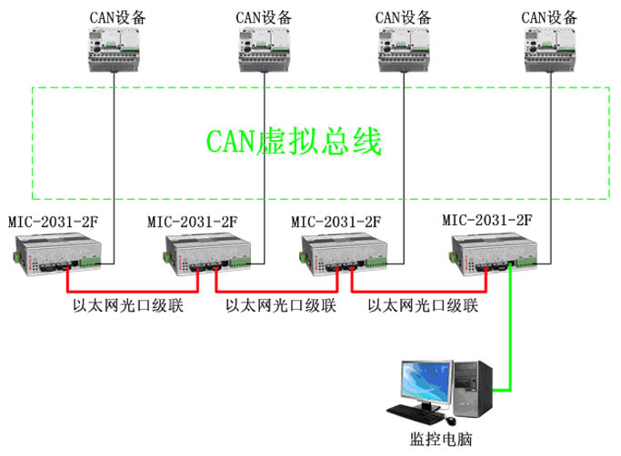 MIC-2031-2F的2個100M光口可以可以使用專用的光纖網(wǎng)絡(luò)將多臺MIC-2031-2F級聯(lián),可以完全保證CAN總線數(shù)據(jù)的傳輸質(zhì)量。使用兆越獨有的虛擬CAN總線技術(shù),實現(xiàn)CAN數(shù)據(jù)借助MIC-2031-2F組成的光以太網(wǎng)絡(luò)進行傳輸,無需設(shè)置即可使用,極大地方便了現(xiàn)場用戶的使用。使用拓撲圖如下: