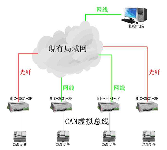 除使用專用光纖網(wǎng)絡(luò)組網(wǎng)外,MIC-2031-2F還可借助現(xiàn)有以太網(wǎng)絡(luò)來進行CAN虛擬總線傳輸,這樣做的好處在于用戶可以直接使用MIC-2031-2F的以太網(wǎng)光口或電口接入現(xiàn)有的局域網(wǎng)來傳輸CAN數(shù)據(jù),不需要額外配置光纜,極大地節(jié)省了用戶成本。