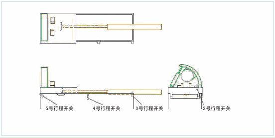 切割過程中和切割完成后平臺(tái)和鋼管依然保持運(yùn)動(dòng),直到平臺(tái)觸碰3號(hào)行程開關(guān),加緊機(jī)構(gòu)松開,平臺(tái)不在和鋼管一起運(yùn)動(dòng)而停止,經(jīng)過一段時(shí)間的延時(shí)后(一般2-3分鐘)圖中橙色部分動(dòng)作推動(dòng)平臺(tái)返回,再回程過程中會(huì)觸碰4號(hào)行程開關(guān),翻料機(jī)構(gòu)(不在這臺(tái)機(jī)床上)動(dòng)作,切下的管子離開切管機(jī)。平臺(tái)回程后會(huì)觸碰5號(hào)行程開關(guān),等待下一段鋼管達(dá)到要求的長度。