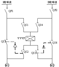如果兩路電源同時(shí)供電,M1工作在變頻狀態(tài),M2工作在工頻狀態(tài)時(shí),QS3和QS4、QS5分閘,QS1、QS2和QS6處于合閘狀態(tài);M2工作在變頻狀態(tài),M1工作在工頻狀態(tài)時(shí),QS1和QS2、QS6分閘,QS3、QS4和QS5處于合閘狀態(tài);如果檢修變頻器,QS3和QS6可以處于任一狀態(tài),其它隔離開(kāi)關(guān)都分閘,兩臺(tái)負(fù)載可以同時(shí)工頻運(yùn)行;當(dāng)一路電源檢修時(shí),可以通過(guò)分合隔離開(kāi)關(guān)使任一電機(jī)變頻運(yùn)行。
