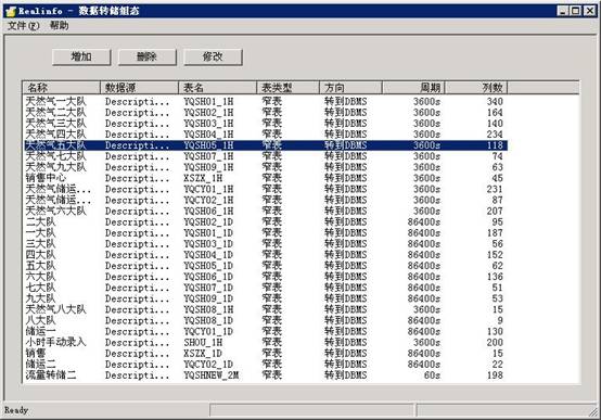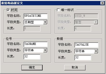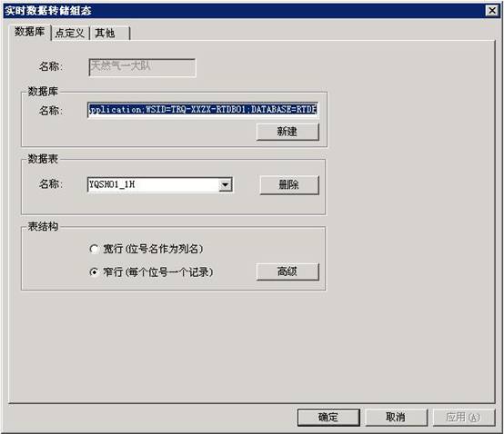 在這個(gè)界面中,用戶(hù)可以完成增加、刪除和修改數(shù)據(jù)表等操作。數(shù)據(jù)轉(zhuǎn)儲(chǔ)組件將轉(zhuǎn)儲(chǔ)的單位定義為數(shù)據(jù)表,用戶(hù)可以定義數(shù)據(jù)表中轉(zhuǎn)儲(chǔ)的數(shù)據(jù)、轉(zhuǎn)儲(chǔ)的時(shí)間和時(shí)間間隔等相關(guān)信息。