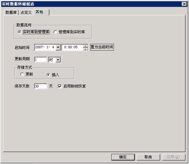 在“其他”標(biāo)簽頁(yè)中,用戶(hù)可以配置數(shù)據(jù)流向、啟始時(shí)間、更新周期、存儲(chǔ)方式等信息。在這里說(shuō)明一下“啟用斷線恢復(fù)”功能。