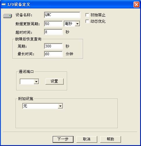 故障后恢復查詢:當連續(xù)發(fā)生5次通訊超時則驅動程序認為設備故障,將停止對設備的讀寫操作,同時按照設定的兩個參數(shù)來檢查設備是否從故障中恢復通訊。周期——當設備故障后查詢故障恢復的時間間隔。最長時間——當設備故障后查詢故障恢復的最長時間,在該時間的段內,驅動程序將按設定周期嘗試向PLC發(fā)送指令建立連接;若在該時間段內不能恢復通訊則不再嘗試連接,直到第二天上午8:00。