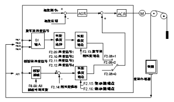 對于1.75m/s以下的中低速電梯,由于運行速度較低,基本不需要啟動補償就可以達(dá)到比較滿意的程度。對于1.75m/s以上的中高速電梯,如果啟動舒適感要求比較高的場合,就必須添加稱重裝置,進(jìn)行啟動轉(zhuǎn)矩的補償。一般有兩種稱重裝置,開關(guān)量檢測和模擬量檢測方式。對于開關(guān)量檢測具有成本低,但只能夠做到有級,一般安裝4個開關(guān),可以在空載和滿載之間實現(xiàn)任意4點的準(zhǔn)確補償,但是由于是有級補償,還不能夠做到理想的程度。模擬量傳感器可以實現(xiàn)無級補償,但是存在的問題是模擬量傳感器往往隨著電梯的使用,其輸出會發(fā)生偏移,造成補償錯誤,效果有時會比不補償還差,因此需要定期對補償增益進(jìn)行調(diào)整。艾默生TD3100電梯專用變頻器啟動轉(zhuǎn)矩補償原理如圖所示