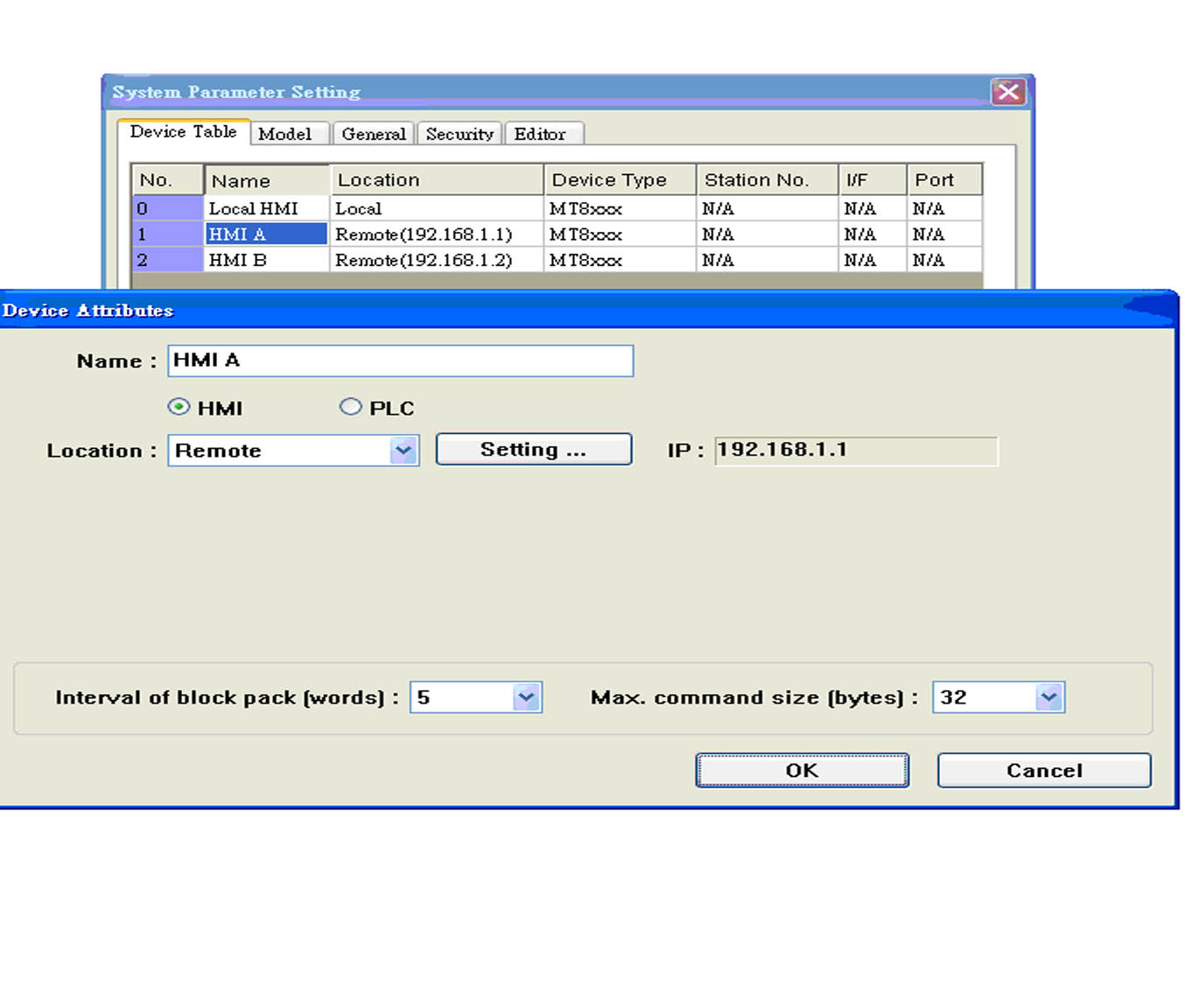 使用EasyBuilder 8000, 并在EasyBuilder 8000 中的[System Parameters]內(nèi)的[Device Table]中, 增加HMI A與HMI B的IP與使用的port號碼。