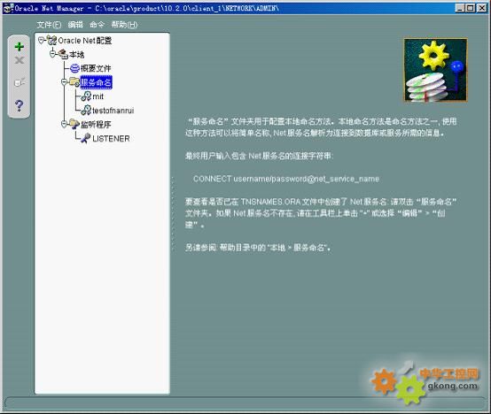 為了便于使用的方便,一般我們把某一個oracle數(shù)據(jù)庫系統(tǒng)上的某一個特定數(shù)據(jù)庫或者全局數(shù)據(jù)庫做一個映射,稱為“服務名”,然后使用服務名即可訪問數(shù)據(jù)庫。使用Net Manager管理工具: