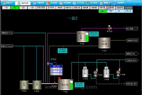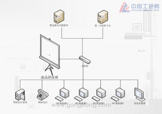 在本系統(tǒng)中,紫金橋?qū)崟r(shí)數(shù)據(jù)庫將現(xiàn)場(chǎng)的多個(gè)OPC數(shù)據(jù)源以及變電所的電力數(shù)據(jù)通過以太網(wǎng)的形式采集過來,然后進(jìn)行數(shù)據(jù)的壓縮保存、同時(shí)對(duì)生產(chǎn)工藝的流程圖進(jìn)行動(dòng)畫的演示,再接下來將處理過后的畫面通過IIS的方式發(fā)布出去,最后由第三方軟件平臺(tái)將紫金橋?qū)崟r(shí)數(shù)據(jù)庫發(fā)布的數(shù)據(jù)與視頻監(jiān)控系統(tǒng)等一起整合,投放到液晶大屏上。