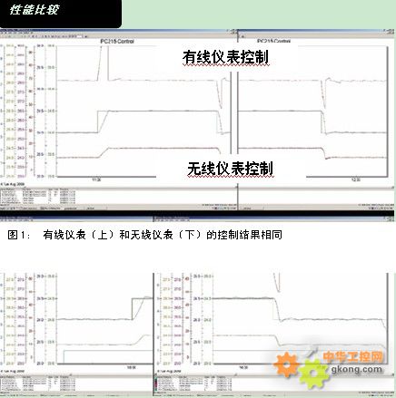 圖1: 有線儀表(上)和無線儀表(下)的控制結(jié)果相同 | 在實驗進行中,我們把WirelessHART技術(shù)的應用進行了擴展,首先用三臺多點無線溫度變送器(每臺設備有4個熱電阻輸入)來監(jiān)測吸收塔的溫度分布情況,另外將兩臺無線pH變送器分別安裝在吸收塔入口和出口,間接測量氨溶液中二氧化碳的濃度。采用無線變送器提高了溫度和pH值測量的精度和可靠性,從而改善了氣提塔和吸收塔的操作條件,由于無線儀表由電池供電,消除了有線儀表回路接地的影響。