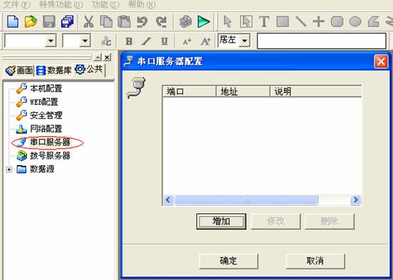進(jìn)入開(kāi)發(fā)環(huán)境,在導(dǎo)航樹(shù)中選擇“公共/串口服務(wù)器”并單擊,出現(xiàn)串口服務(wù)器配置框: