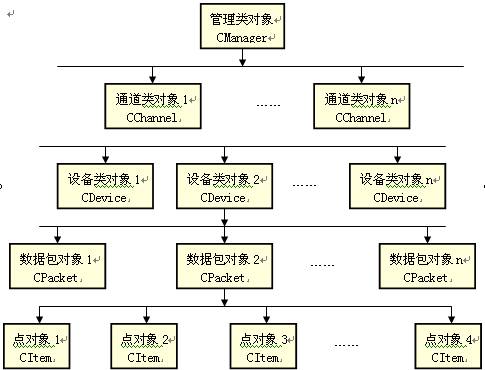 每一個調(diào)度程序都會創(chuàng)建唯一的管理類(CManager)對象來管理著所有的其他對象,該對象同時管理著一系列的通道對象。所謂的通道(CChannel)對象其實是一系列的通訊介質(zhì)的抽象,比如一個串口就可以抽象為一個通道對象,再比如一個網(wǎng)絡的端口也可以抽象成一個通道對象。調(diào)度程序的通道對象隱藏了各種通訊介質(zhì)的差別,驅(qū)動編制者可以不用關心通道的具體細節(jié)。在每一個通道對象的內(nèi)部又管理著若干的設備(CDevice)對象。這種關系可以這樣來理解,比如我們在計算機的Com1口上通過Rs485總線聯(lián)結(jié)了3臺設備,在Com2口上聯(lián)結(jié)了一臺設備。那么調(diào)度程序在運行時就會首先創(chuàng)建一個CManager對象,然后再創(chuàng)建兩個CChannel對象讓CManager對象來管理,它們分別對應Com1和Com2口。然后在Com1對象內(nèi)創(chuàng)建三個CDevice對象和三臺設備相對應,在Com2對象內(nèi)創(chuàng)建1個CDevice對象。在CDevice的下一級是包對象(CPacket),設備采集數(shù)據(jù)的時候總是以包為單位進行采集。在包對象的內(nèi)部又包含著若干的點(CItem),一個點對應著一個從實時數(shù)據(jù)庫位號到實際設備的連接,從設備中采集到的數(shù)據(jù)首先被放到點中,然后才送入實時數(shù)據(jù)庫中去的。