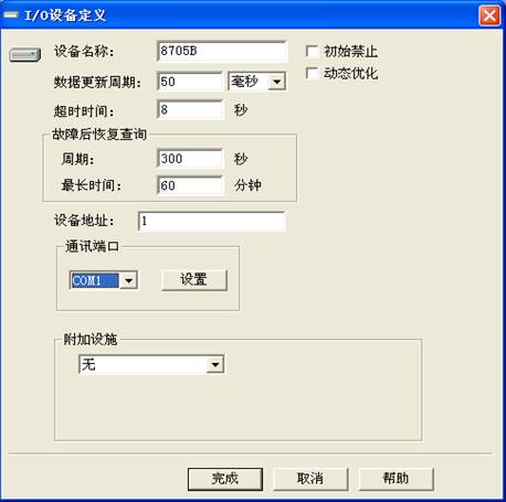 可以看到在此對話框中需要我們輸入設備名稱,調(diào)度程序就是使用設備名稱來得到設備配置的。同時還可以看到在此對話框中需要我們輸入設備地址,選擇并配置通訊端口。此對話框由紫金橋系統(tǒng)提供,是一個缺省的定義設備的對話框。一些簡單的設備,使用缺省的設備定義對話框即可完成定義,而一些復雜的設備就必須要求驅(qū)動程序提供進一步的設備定義。