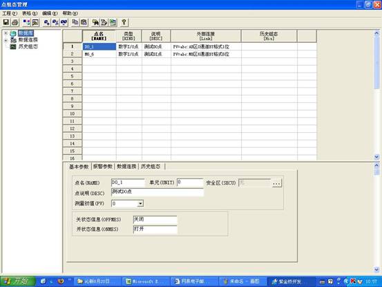其次雙擊“數(shù)據(jù)庫(kù)”導(dǎo)航樹(shù)里的“點(diǎn)組態(tài)”圖標(biāo)進(jìn)入點(diǎn)組態(tài)畫(huà)面,建立兩個(gè)數(shù)字I/O點(diǎn)M6_6和DO_1,M6_6與PLC中點(diǎn)M6.6連接, DO_1與PLC中點(diǎn)QO.1連接。如圖6所示