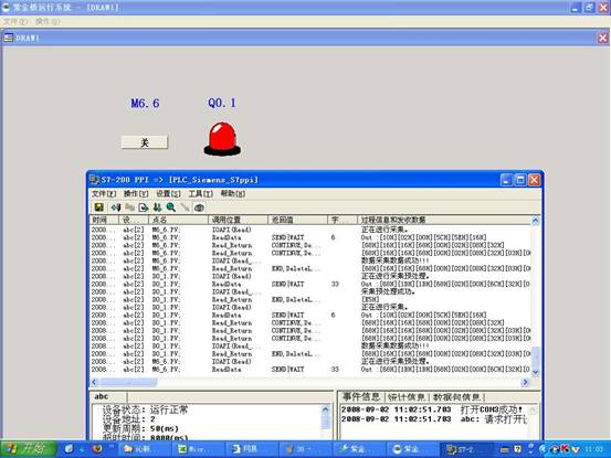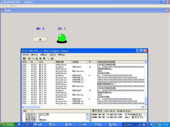 所有組態(tài)完成后點(diǎn)擊“運(yùn)行”按鈕菜單欄上的一個(gè)指向右側(cè)的綠色箭頭圖標(biāo),如果打開(kāi)紫金橋軟件的西門(mén)子200系列PPI通訊程序可以看到發(fā)送和接收的數(shù)據(jù)不斷滾動(dòng),并由“采集成功”字樣,證明通訊成功。如圖8所示