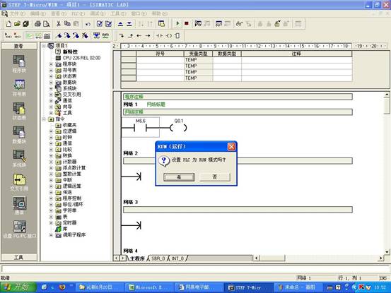 然后在程序塊里編制一個(gè)小梯段讓PLC中的一個(gè) M點(diǎn)M6.6去控制一個(gè) DO點(diǎn)Q0.1。最后把程序下載到PLC里,下載完成后把PLC的運(yùn)行狀態(tài)打到RUN狀態(tài)。如圖3所示
