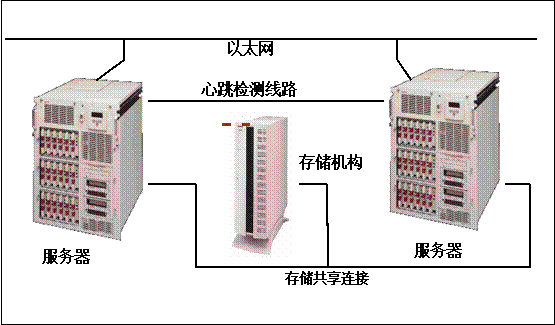 圖中的兩臺(tái)服務(wù)器分別具有一個(gè)本地盤用于安裝操作系統(tǒng)。服務(wù)器中分別安裝由兩塊網(wǎng)卡,其中一組網(wǎng)卡用于網(wǎng)絡(luò)服務(wù)的提供,另一組網(wǎng)卡通過一條心跳網(wǎng)線構(gòu)成了一個(gè)內(nèi)部互連的高速網(wǎng)絡(luò),這個(gè)高速網(wǎng)絡(luò)是用于兩臺(tái)服務(wù)器之間的信息傳遞。所有要求維護(hù)高可用性的數(shù)據(jù)和應(yīng)用程序代碼都存儲(chǔ)在共享的存儲(chǔ)設(shè)備中,這也是該方案的關(guān)鍵部分。兩臺(tái)群集服務(wù)器之間通過專用心跳檢測(cè)線路連接在一起,必須保障這條專用心跳檢測(cè)線路的可靠,他是整個(gè)群集服務(wù)器可靠工作的基礎(chǔ)。群集服務(wù)器之間通過這條線來傳送信息,判斷是否其中一個(gè)服務(wù)器出現(xiàn)了故障,從而進(jìn)行工作切換。