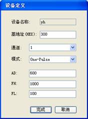設(shè)備定義的最后一頁(yè),需要填寫(xiě)詳細(xì)信息;這里選擇通道1 , One-Pulse 模式,給出上下限后,點(diǎn)擊完成按鈕。注意:基地址必須和中斷中的設(shè)置一致。