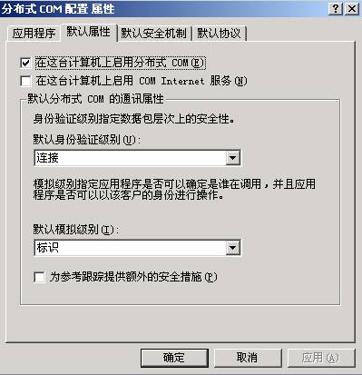 選擇開始-〉運行,輸入“dcomcnfg”,并選擇“確定”。這時會彈出“分布式COM配置屬性”對話框。選擇“默認(rèn)屬性”標(biāo)簽頁,將“在這臺計算機(jī)上啟用分布式COM”選擇上。