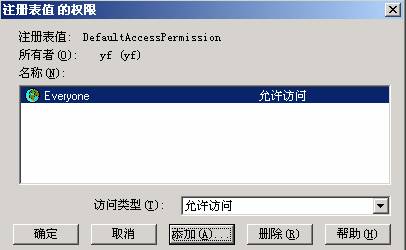 在“訪問權(quán)限”欄中選擇“編輯默認(rèn)值”,并在其后彈出的對話框內(nèi)添加用戶:Everyone,“訪問類型”為:“允許訪問”。